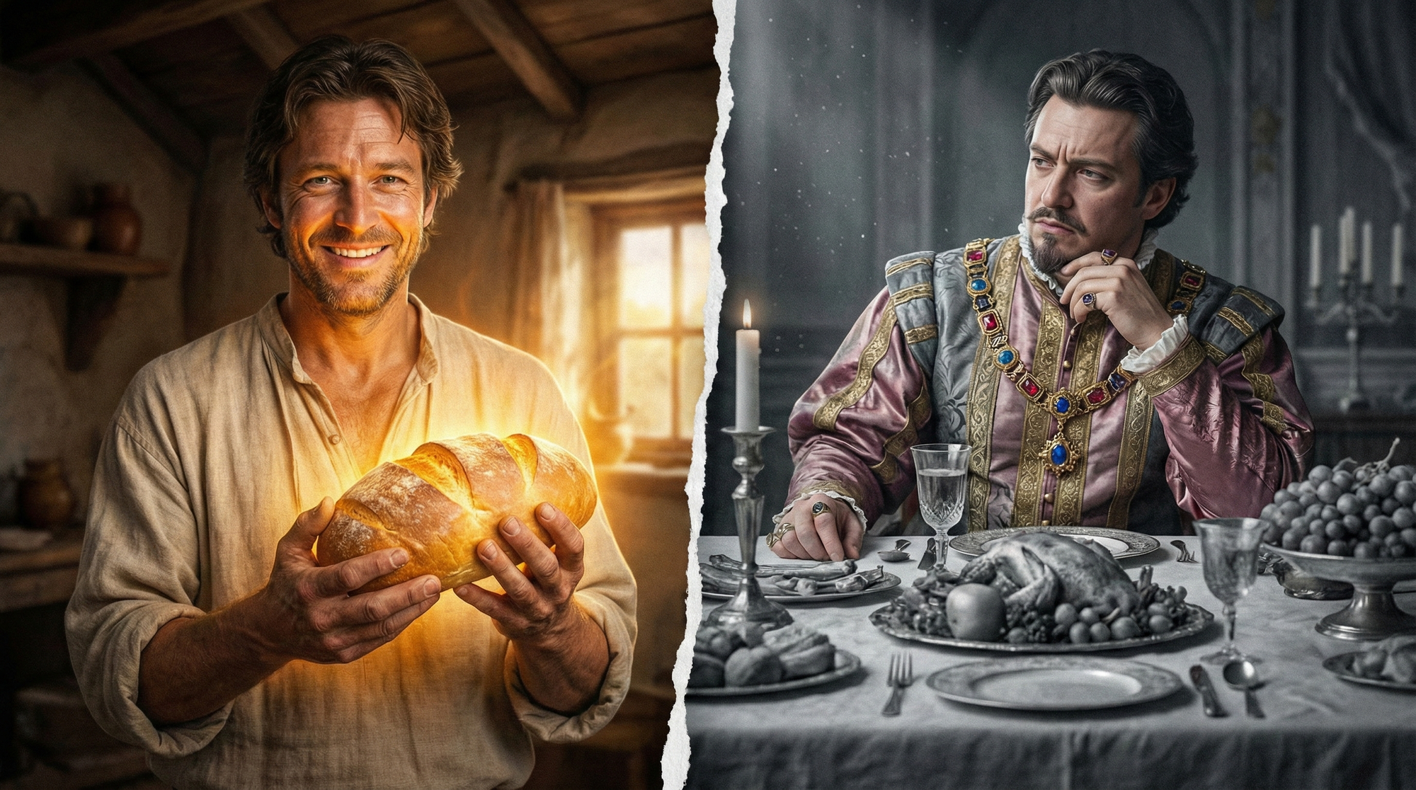 Cuando el Simple comía su pan seco, su alegría y su gratitud eran tan inmensas, su intención de "hacer el bien" (incluso hacia su propia alma) era tan pura, que él sentía el sabor de los manjares más exquisitos.